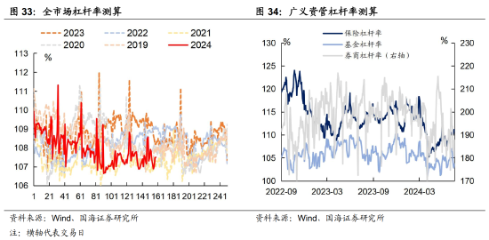 本周全市场杠杆率为107.5%,较上周增加0.2个百分点。广义资管方面,本周保险机构杠杆率录得110.8%,较上周增加0.5个百分点;基金杠杆率录得103.7%,较上周减少0.9个百分点;券商杠杆率录得186.5%,较上周增加3.2个百分点。