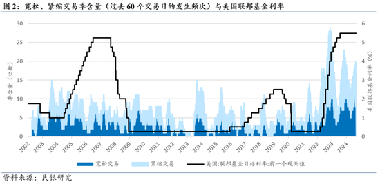 从历史走势看,宽松与紧缩交易往往在政策拐点处脉冲式增加。此外,在急速加息或急速降息期间也会有所增多。比如在2022-2023年历史性的快速加息中,紧缩交易的含量也急速升高。此外,加息对于宽松与紧缩交易的影响要略高于降息。