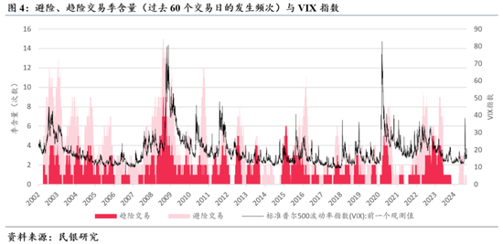 VIX指数(标普500波动率指数)是衡量市场恐慌情绪的一个指数,我们分别用避险交易和趋险交易的季含量,与过去3个月VIX指数平均值做相关性分析。结果表明,避险交易与VIX指数的相关系数为0.4,趋险交易与VIX指数的相关性同样为0.4。当市场恐慌情绪升高时,避险和趋险交易含量均会上升。从历史趋势看,避险与趋险交易与VIX指数的走势相当接近且同步性很高。
