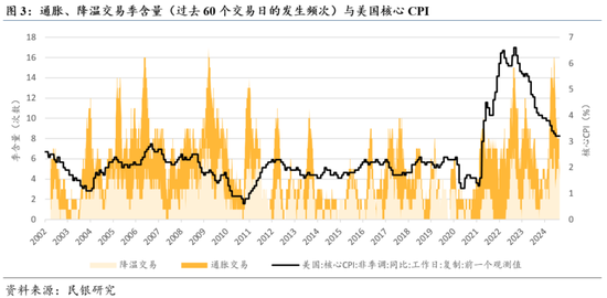 我们分别用通胀交易和降温交易的季含量,与美国核心CPI的季度预期(定义为3个月后的核心CPI减去当前核心CPI,作为市场对未来3个月核心通胀预期的一个代理变量,前提假设是市场对通胀的变化为理性预期)进行相关性检验。结果表明,通胀交易与通胀预期的相关系数为0.09,降温交易与通胀预期的相关性为-0.11。当市场预期未来3个月核心通胀上升时,通胀交易含量会小幅上升,而其反向的降温交易则会小幅下降。
