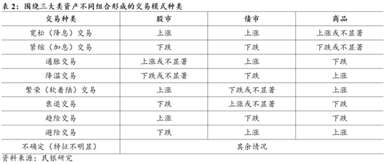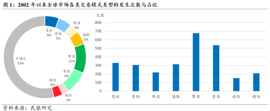 我们对2002年以来共5700多个交易日进行筛选,将股市、债市、商品的日度涨跌幅,按照历史涨幅排序各三分之一进行分组,前33.3%定义为上涨,中间33.3%定义为不显著,后33.3%定义为下跌。并按照规则对交易模式进行判定。结果显示,53%的交易日判定为“不确定”,其余47%的交易日中,繁荣与衰退交易分别占比11%和9%;宽松与紧缩交易分别占比6%和5%;通胀与降温交易分别占比5%和4%;避险与趋险交易分别占比4%和3%。