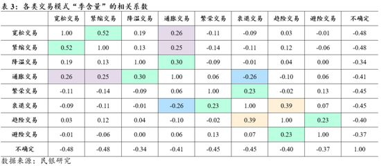 一是同一个“交易对”中互为相反的交易呈现较高的正相关性(表3中浅绿色表示)。比如宽松交易和紧缩交易相关系数为0.52,表明在一个季度内,宽松交易含量越高,紧缩交易的含量也会随之升高。这或是由于市场超调机制,导致当某种交易模式增多后,用于修正市场超调的反向交易也相应增加。
