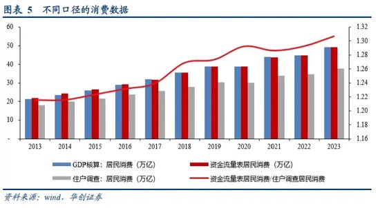居民消费支出同样存在数据统计问题。居民消费有三类数据,一类GDP支出法核算的居民消费,一类是资金流量表年度披露的居民消费,还有一类是季度披露的住户调查的人均消费支出。量级层面,资金流量表披露的居民消费与GDP核算的居民消费基本相等,但高出了住户调查的人均消费支出。参考许宪春著作的书籍《中国政府统计问题研究》,数据口径产生差异的原因可能主要有以下四点:①住户调查的居民消费包含农村居民购买生活用房支出、建筑生活用房材料支出、城镇居民住房大型维修、大型装潢支出,而资金流量表的居民消费不包含这些部分。②资金流量表的居民消费包含国家财政为农村居民支付的新农合医疗和医药费,社保基金为城镇居民支付的医药费和行政事业单位职工享受的公费医疗和医药费,而住户调查数据不包含这些。③资金流量表的居民消费包含居民对金融中介服务,保险服务和自有住房的消费,而住户调查数据不包含这些。④调查口径问题。资金流量表的调查口径采用了部分与住户调查数据不同的来源。