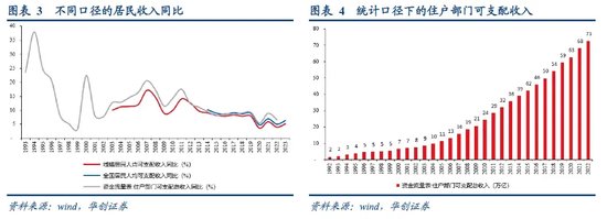 2、人均可支配收入,对于这一数据的探讨,我们先来区分两组数据口径。可支配收入有两类数据,一类年度披露的资金流量表的住户可支配收入,一类是季度披露的住户调查的人均可支配收入。资金流量表的可支配收入=劳动者报酬+营业盈余+财产净收入+经常转移净收入;住户调查的居民可支配收入=工资性收入+经营净收入+财产净收入+转移净收入。两种可支配收入虽然在计算上存在一一对应的关系,但在实际数据层面,资金流量表的可支配收入是住户调查的可支配收入的1.4倍,结合许宪春著作的书籍《中国政府统计问题研究》,背后可能有两方面原因: