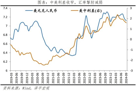 全球央行开启降息潮,货币政策空间打开。9月19日凌晨美联储宣布降息50bp,中美利差收窄、汇率掣肘减弱,国内货币政策空间打开。2024年3月以来,瑞典、瑞士、墨西哥、加拿大、英国、欧元区等经济体相继宣布降息;美联储降息后,采取固定汇率制的经济体也跟进下调利率。8月以来,人民币持续升值;9月24日,美元兑人民币为7.05,人民币保持升值态势。