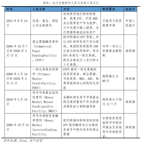 一是证券、基金、保险公司互换便利。方式上,机构使用他们持有的债券、股票ETF、沪深300成分股等资产作为抵押,从中央银行换入国债、央行票据等高流动性资产,获取的资金只能用于投资股票市场。力度上,首期操作规模5000亿元,后续可视情况扩大规模至1-1.5万亿。影响上,该新工具与美联储为流动性纾困创办的CPFF、PDCF、MMLF等各式工具类似,都是优质机构通过抵押将低流动性资产换取成高流动性资产从而为市场提供活跃资金。关键区别在于证券、基金、保险公司互换便利强调只能投资股票市场,而上述工具对换取的资产流向未作定向约束。反应出央行活跃资本市场的信心。该工具打通了央行直接通过非银机构投放流动性的渠道,不再仅依靠央行旗下券商直接买入和银行间接传导的投放方式,更加直接有效。
