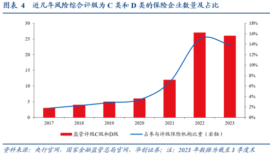 C类和D类机构或集中在中小规模寿险机构。据央行《中国金融稳定报告(2023)》,2022年四季度,27家C类和D类机构中,“大部分是中小人身险公司”;寿险中,“21家风险综合评级为C类或D类的寿险公司中,10家为资产规模在1000亿元至5000亿元的中型寿险公司,9家为资产规模在1000亿元以下的小型寿险公司”。