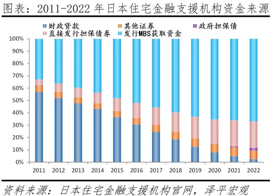改建后的住房银行市场化程度显著提高、对财政资金依赖度大幅下降,2011-2022年,财政资金占比由57.2%降至4.4%。住宅金融支援机构的目标之一是摆脱原有住宅金融公库对财政资金的依赖、实现较充分的市场化运作。经过15年运营,其基本实现这一目标,2011年,住房金融支援机构资金来源中,财政贷款及政府担保债占比57.2%,发行MBS获得的资金占比32.9%;2022年,前者降至4.4%,后者增至66.8%。