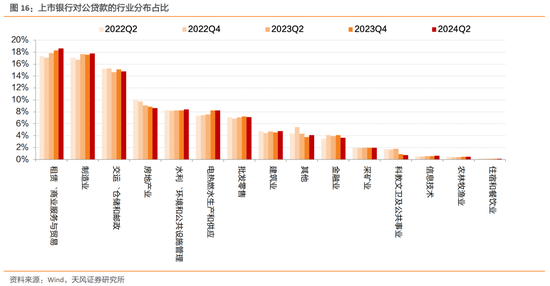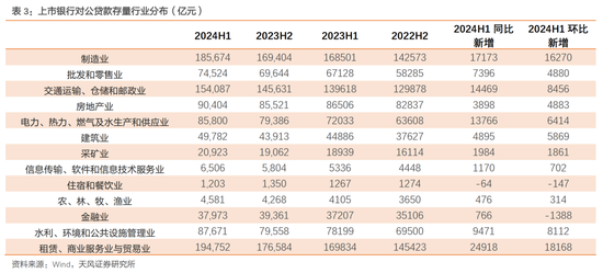 从数据上观察,基建、制造业贷款依旧是增量贷款的主要贡献来源。2024年上半年上市银行新增贷款主要流向了租赁/商业服务与贸易业、制造业、交通运输/仓储和邮政业、电热燃气水生产和供应业、水利/环境和公共设施管理、批发零售等。