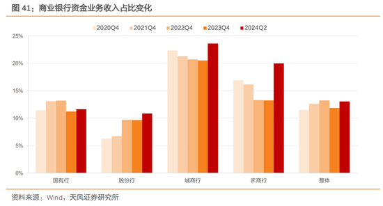 进一步观察资金业务,分类别看,城商行、农商行资金业务占比较2023年末上升较多,国有行、股份行均小幅提升。