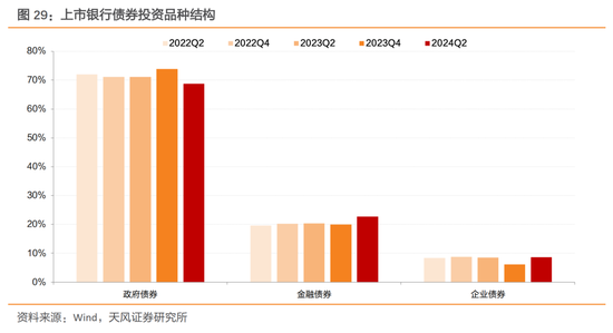 标准化债券配置种类方面,对比2023年末,2024年上半年商业银行投资政府债券占比下降,金融债券(包含同业存单)和企业债券占比上升。