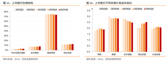 2024年上半年商业银行整体应付债券成本下行,同业负债成本上行。