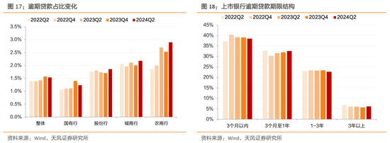 2024年上半年上市银行贷款逾期占比较2023年末小幅下降0.04个百分点。分银行类型看,股份行、城商行、农商行逾期贷款占比均有增加,国有行逾期贷款占比下行。