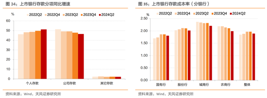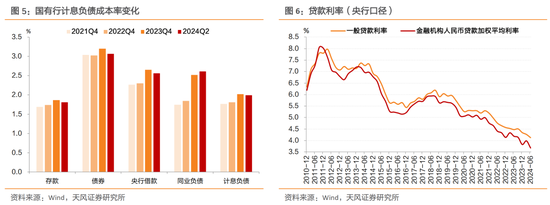 存款利率下降对负债端成本率影响将逐步显现。2022年至2023年,存款利率虽然经历三次集中下调,但是国有行存款成本却不降反升,主要原因在于部分银行挂牌利率下调但是对公存款利率没有随之下调,存在高息揽存的问题。今年4月,市场利率定价自律机制下发《关于禁止通过手工补息高息揽储 维护存款市场竞争秩序的倡议》 ,明确手工补息是对业务操作失误的勘误环节,不应异化为绕开内部定价授权、实施变相利率补贴的违规行为。今年上半年,国有行存款成本小幅下降,预计随着此前存款挂牌利率下降的滞后影响显现以及未来存款利率的进一步下调,银行负债端成本或许有所改善,但是很难完全改变息差下滑的局面。