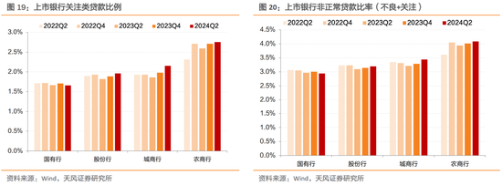 从关注类贷款占比和非正常贷款(不良+关注)占比来看,除国有行外,股份行、城商行和农商行资产质量延续了2023年末的恶化情况,股份行、城商行、农商行的关注类和非正常贷款占比均有所上升。