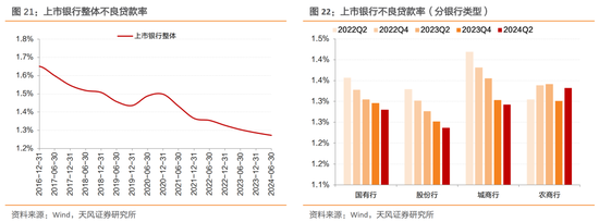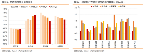 分区域分布看,我们依旧以上市的国股行(基本实现全国展业)中选择披露了长三角、珠三角、环渤海、中西部等重点地区的部分银行为样本。观察贷款不良率的区域分布情况,2024年上半年贷款不良率持续分化,长三角、珠三角地区贷款不良率小幅上升,而环渤海、中西部地区贷款不良率持续下降。