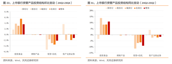资管产品方面,2024年上半年来看商业银行持有公募基金占比均大幅提升(同环比),持有理财、资管和信托以及ABS的占比下降(同环比)。
