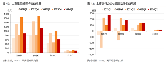 2024年上半年,上市银行的投资净收益规模同比增长28.0%,分类别看,国有行、股份行、城商行、农商行投资净收益规模分别同比增长10.5%、40.9%、30.8%、67.4%。上市银行的公允价值变动净收益规模同比增长5.6%,分类别看,国有行、城商行公允价值变动净收益规模分别同比增长16.5%、22.2%,股份行、农商行公允价值变动净收益规模分别同比下降11.8%、23.0%。
