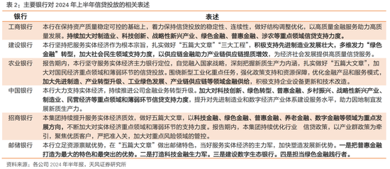 从主要银行对2024年上半年信贷投放的总结回顾来看,以国家重点政策导向为依托,先进制造业、战略新兴产业、绿色金融、普惠小微等领域是2024年上半年商业银行信贷投放的重点支持方向。