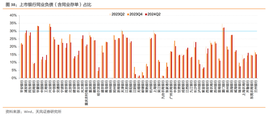 从同业负债监管角度考虑,如果将同业存单包含进同业负债,统计的58家银行中,相比2023年末有28家同业负债占比上升,其中,工商银行、长沙银行、西安银行同业负债占比上行超过3个百分点,浦发银行、华夏银行、兴业银行、厦门银行四家银行同业负债占比超过30%。