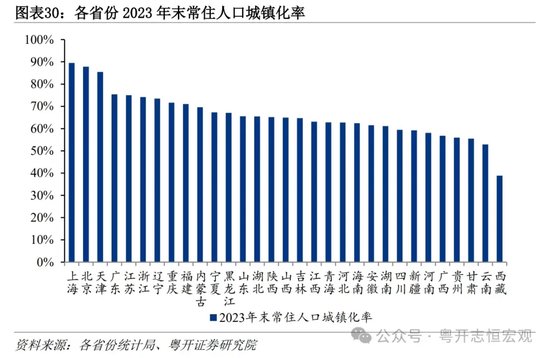 最后是人口城镇化进程步入下半场,对应城市基建增量需求放缓,但存量更新需求提升。改革开放以来,中国城镇人口从1978年的17245万人上升到2022年的93267万人,常住人口城镇化率则从1978年的17.92%上升到2023年的66.16%。伴随着快速的人口城镇化,城市基础设施建设如火如荼开展。常住人口城镇化率在1996~2016年保持年均增幅超过1.4个百分点,此后开始呈现下降态势,2021年首次低于1个百分点。预计我国城镇化率提升将继续呈现放缓趋势,与城镇化增速直接相关的住房建设、城市道路、社区设施建设也将会面临调整。根据各省统计局的抽样调查结果,2023年,除了西藏以外的30个省份常住人口城镇化率均超过50%。上海、北京、天津城镇化率超过了80%,达到高收入经济体城市化水平;广东、江苏、浙江、辽宁、重庆、福建五省份城镇化率处于70%至80%之间,达到中高城镇化率水平。未来我国城市建设将从增量建设逐步转向增量建设与存量更新并重的时代。