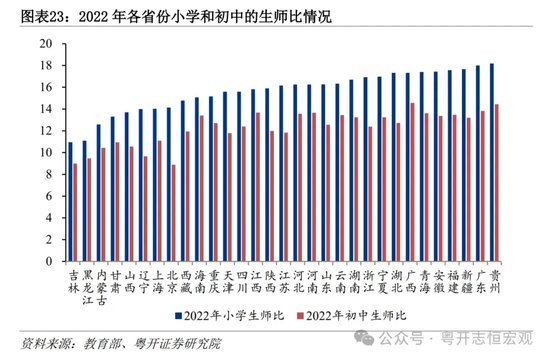 2、民生:人口大省医疗和教育资源紧张。一是广东、福建人均床位数少,人均医护人员指标较低,农村医护人员不足。二是广东小学的生师比大幅高于全国水平,河南小学生均教育经费排名倒数第一,基础教育资源较为稀缺。