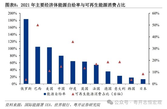 从能源结构看,我国可再生能源快速发展,能源自给率有所提升。在能源安全战略引领下,我国不断加强能源生产保障,大力发展风能、光伏等可再生能源。2021年,我国一次能源自给率达到80%,低于俄罗斯(184%)、巴西(105%)、美国(104%),高于印度(64%)、日本(13%)及欧洲主要经济体。2021年,我国可再生能源消费占比达14.8%,位于主要经济体中游水平,高于英国(13.5%)、美国(11.2%),略低于德国(18.6%)、法国(16.9%)。