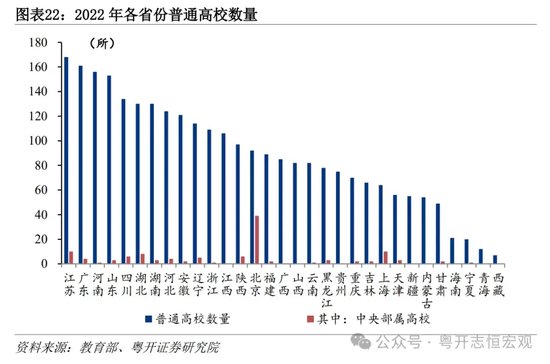 从高等教育来看,高等学校数量的分布整体呈现出东多西少的特点。2022年,高校数量排名靠前的省份为江苏(168)、广东(161)、河南(156)、山东(153)、四川(134)、湖北(130),靠前的都是经济大省。而西北、东北、西南地区高等教育资源较为落后。考虑人口因素后,每十万人口中平均高校在校生的数量也表现为东多西少。排名前列的省市依次是天津(5428)、北京(5397)、吉林(4989)。
