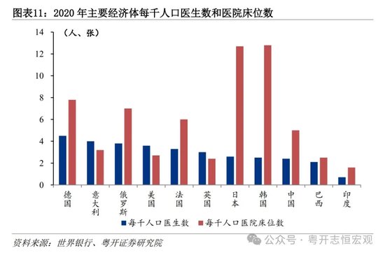人均医疗资源方面,中国医生数和病床数也低于发达经济体。其中,中国每千人医生数量为2.4人,与日本(2.6人)、英国(3.0人)、美国(3.6人)虽有差距,但并不大。从人均床位数看,我国与日韩的差距更大。根据世界银行数据库,2020年中国每千人口医院床位数为5.0张,而日本、韩国、德国、法国每千人口医院床位数分别12.7张、12.8张、7.8张、6.0张。