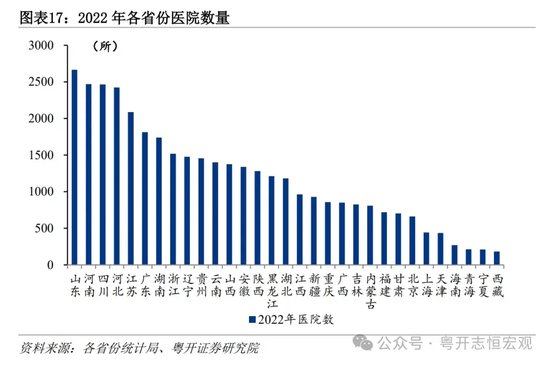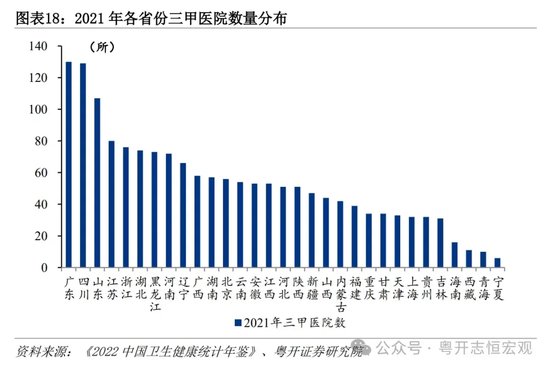 整体上,医疗资源集中在经济较为发达或人口稠密地区。近年来,医疗卫生投资补短板力度加大。从医院数量来看,2022年人口大省山东(2666所)、河南(2470所)、四川(2465所)、河北(2423所)、江苏(2087所)排名前五,较2019年都有不同程度增长。从三甲医院数量来看,除人口因素外,医疗资源还与经济发展水平密切相关,2021年末全国三级甲等医院1651所,广东(130所)、四川(129所)、山东(107所)三甲医院数量排名前列。