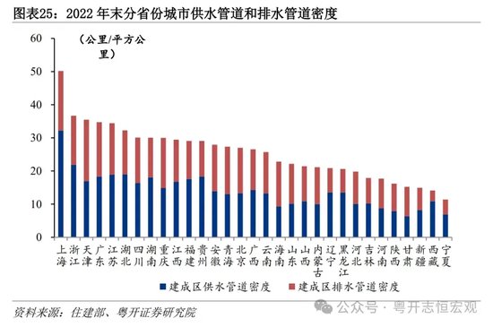 从市政看,东部地区一线城市市政管网密度高于其他地区。根据国家发改委披露,截至2020年底,全国已有城市和县城燃气管道约105万公里,供水管道约127万公里,排水管道约102万公里,供热管道约48万公里。超大特大城市人口密度高,地下管网改造的任务更加艰巨。根据住建部统计,上海2022年城市建成区每平方米公里供水和排水管道合计50.17公里,远高于全国城市管道密度(27.22公里);北京每平方公里燃气管线密度达21.8公里,密度高于全国平均水平(13.3公里)。