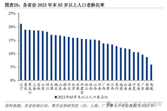 其次是人口老龄化带来的影响,基建投资需要适应中度老龄化社会的需要。目前我国60岁及以上老年人口占比超20%,一方面,老龄化加剧后,适配新增人口的基建投资势必减少;另一方面,人口老龄化会加剧财政压力,养老金缺口和医疗健康的财政支出会加大。2023年末,全国60岁及以上老年人口29697万人,占总人口的21.1%;全国65岁及以上老年人口21676万人,占总人口的15.4%。我国人口老龄化的区域差距较大,从老龄人口占比来看,全国有19个省份65岁及以上人口占比超过14%,满足中度老龄化社会标准。东北情况较为严重,2023年辽宁65岁及以上人口占比21.1%,达到重度老龄化社会标准,吉林、黑龙江分别达18.6%、18.8%,川渝地区和江浙沪地区老龄化率也较高。国家卫健委预计到2035年左右,60岁及以上老年人口将突破4亿,人口占比将超过30%,全国进入重度老龄化阶段。我国老龄化人口数量多、增长快、区域差异大,围绕老年民生保障的基建投资有望发力。