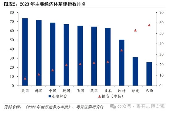 总体上,中国基础设施建设加快,与国际的差距正在缩小。根据瑞士洛桑国际管理发展学院发布的《2024年世界竞争力年报》,对世界上67个经济体的竞争力进行评价,其中基础设施水平评价指数涵盖交通、科技、医疗、教育等各项设施,是衡量国家竞争力的重要指标之一。报告显示,中国在基础设施方面位列第15,弱于北欧国家、新加坡(第4)、美国(第7)、韩国(第11)等经济体,但排名已超越德国(第20)、法国(第21)、英国(第22)、日本(第23)等经济体。