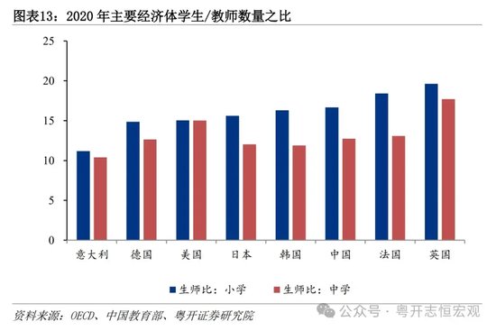 4、教育:基础教育师资丰富程度不及日韩。一是从教育经费看,2020年我国财政性教育经费为4.29万亿元,相当于GDP的4.22%,略低于OECD国家平均值的4.33%。二是从师资看,我国在主要经济体中位居中游,中小学的生师比与日韩仍有差距。2020年我国小学的生师比为16.7,高于德国的14.9、日本的15.6、韩国的16.3。