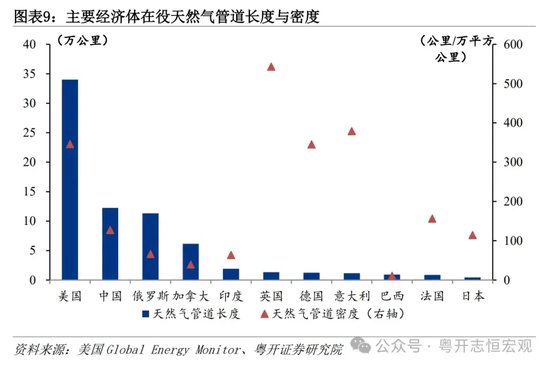 从能源传输看,我国天然气管道建设仍需加力,与欧美相比仍有差距。从运输管道总量看,根据美国智库全球能源监测组织(GEM)2024年9月数据,中国运营中天然气管道长度为12.2万公里,国际排名第二,相当于美国的三分之一左右。从管网密度看,英国、美国、德国每万平方公里燃气管道分别达543公里、346公里、345公里,天然气管网建设基本成熟,能够满足居民燃气消费需求;而中国每万平方公里燃气管道长度达127公里,国际比较上落后于美国、英国。