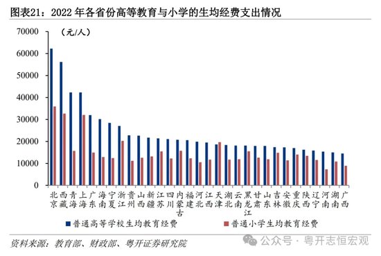 从教育经费看,山东、河南人口大省人均教育经费投入排名靠后。根据《2022年全国教育经费执行情况统计公告》,全国财政性教育经费48473亿元,其中一般公共预算教育经费39257亿元,包括中央财政教育经费5716亿元。从地方层面看,2022年,山东、福建、广东教育经费支出占地方一般公共预算支出的比重位列前三,分别为21.4%、21.0%、20.8%,北京、上海教育经费占地方一般公共预算支出的比重相对较低,仅为15.5%、11.6%。北京、上海高等教育生均经费分别为6.22万元、4.23万元,分列全国第一、第四,可能与中央直属高校接受中央教育经费较多有关。而人口大省山东、河南高等教育生均经费仅1.80万元、1.54万元,分别排名第23位、第29位。小学教育阶段,北京生均教育经费3.59万元,位居第一;而河南生均教育经费仅0.73万元,位居倒数第一,仅相当于北京的五分之一。