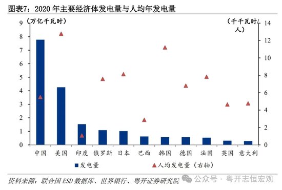 能源方面,中国发电量自2011年以来常年位居全球第一,但人均发电量水平不高。从电力覆盖面来看,我国2015年实现全部人口通电,而另一人口大国印度2016年仅有84.5%的人口通电,除印度外的主要经济体基本实现所有人口通电。从人均发电量看,2020年我国人均发电量(5.5千千瓦时/人)位于主要经济体中下游,高于人口大国印度(1.1)、巴西(2.9),与俄罗斯(7.6)、日本(8.1)、韩国(11.2)、美国(12.8)等国仍有较大差距。