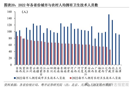 医疗条件城乡差距明显,农村人均医护人员数量大幅落后于城市。根据国家统计局,2022年,我国城市、农村地区每万人拥有卫生技术人员分别为102人、66人,城市是农村的1.5倍。分省份看,广东、福建、江西、辽宁、西藏农村人均医护人员远低于全国水平,每万人拥有卫生技术人员56人、55人、55人、54人、46人。西藏、山西人均医护人员数量城乡差距较大,城市人均卫生技术人员相当于农村的3.3倍、2.0倍。