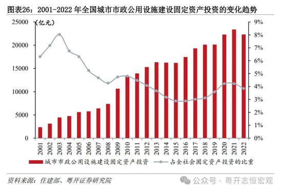 城市更新相关投资是未来政府基建投资的重点。我国城市发展已步入存量更新时代,城市更新通过维护、整建、拆除、完善公共资源等方式优化城市空间资源配置,既包括人口密度较高的中心城区的公益性市政工程,也包括城中村改造、危旧住房改造等居住环境的改造项目。根据新华社2024年7月19日转引住建部数据,全国城市更新项目已累计完成投资2.6万亿元,包括实施完善社区建设、更新改造老厂区、老商业街区、建设和改造医疗、体育、教育、文化设施等项目超6.6万个。根据住建部《2022年城市建设统计年鉴》,我国城市市政公用设施投资规模从2001年的2352亿元,快速增长至2021年的2.33万亿元,年化增速超12%;市政公用设施建设占固定资产投资约4%,未来有望大幅提升。