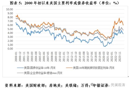 QE以来,美国主要利率或债券收益率呈下行趋势。2008年10月末(美联储正式引入QE前夕),美国10年期国债收益率、30年期房地产抵押贷款固定利率和穆迪Aaa评级企业债收益率,分别处于2000年1月至2024年9月间的68.5%、81.0%和90.2%分位。到2021年10月底(美联储开启本轮无限QE退出前夕),前述三个利率或收益率分别处于8.1%、5.7%和4.3%分位(见图表5)。