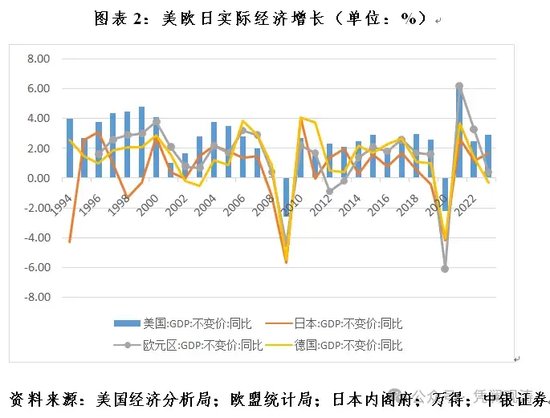 后QE时代,美国实际经济增速快于欧洲和日本。2009~2023年,美国年均增长2.21%,欧元区增长1.15%(其中德国增长1.35%),日本增长0.88%。美国这种领先优势较2008年危机前五年进一步扩大。2004~2008年,美国、欧元区、德国、日本分别年均增长2.43%、2.08%、1.95%和1.13%。疫后经济恢复的速度最具说服力。美国于2021年实物经济总量恢复至新冠疫情前的水平,欧元区、德国是2022年,日本则是2023年(见图表2)。