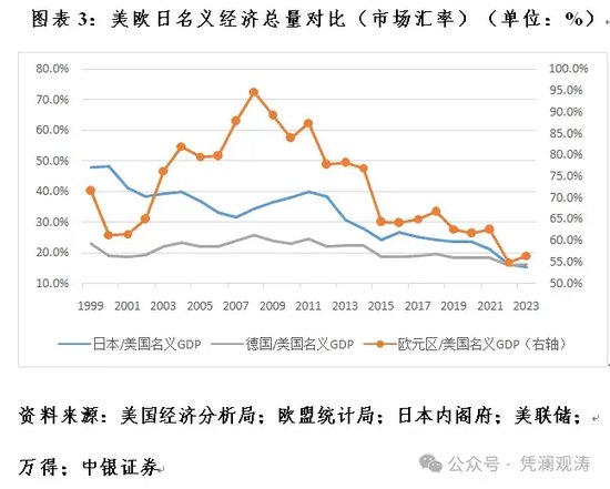 美国名义经济总量的领先优势更为明显。2008年,以市场汇率折算的欧元区、德国、日本的名义GDP分别相当于美国的94.8%、25.8%和34.6%,到2023年分别降至56.6%、16.3%和15.2%。若以日本和欧洲央行开始QE的时间为起点,日本经济的下降趋势更加显著。2000年,日本名义GDP相当于美国的48.5%;2014年,欧元区、德国分别为77.0%、22.5%(见图表3)。