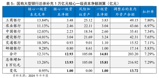 二是安排发行1万亿元特别国债注资六家国有大型银行。为六家国有大型银行整体补充1万亿元核心一级资本净额,将提升整体核心一级资本充足率0.95个百分点,同样按照7.29%的杠杆率计算,将增加约13.72万亿元的表内外资产余额增长空间(如表5所示)。