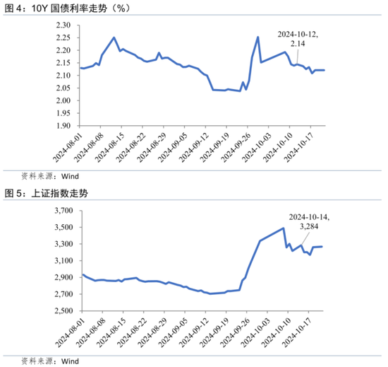 财政部新闻发布会当天,10Y国债利率微幅上行,上证指数在会后第一个交易日明显上涨,后随发布会信息逐步被消化,二者均略有下行。但由于加力化债和补充国有大型银行资本的具体实施方案尚未确定,债券市场对政策超预期的情况始终有所担忧,10Y国债利下行受阻,稳在2.1%上方。股票市场则在前期情绪回落影响下有所走跌,但在财政部新闻发布会积极的信号作用下,上证指数未形成明显向下突破,整体稳在3200点上方。