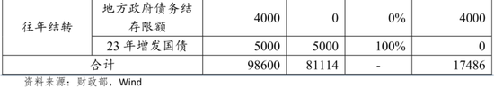 从赤字率和一般国债发行的关系来看,若财政赤字安排不超4%,今年年内和明年一般国债增发均至多1万亿元。今年年初赤字率安排为3%,若年内再增发1万亿元一般国债,赤字率需上调至3.7%,若增发2万亿元或3万亿元则需分别上调至4.4%和5.2%。假设今年实现年初的增长和通胀计划,明年计划增长5%、通胀率3%、赤字率3%,地方赤字保持7200亿元不变,则中央赤字约37000亿元,一般国债较今年额度仅增加3600亿元,若要多增1万亿元,赤字率需为3.7%,若多增2万亿元和3万亿元则需分别安排赤字率为4.4%和5.0%。财政部新闻发布会指出“中央财政还有较大的举债空间和赤字提升空间”,不排除今年年内或明年将赤字率提升至4%以上,增发2万亿元一般国债。