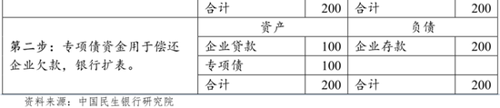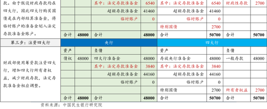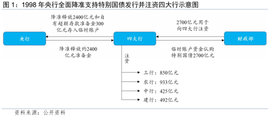 1998年财政部注资四大国有大型银行时,央行曾通过全面降准5个百分点,为四大行释放2400亿元准备金于临时账户,用于2700亿元定向发行特别国债的购入。但是分析央行和四大国有大型银行的资产负债表可以看出,央行降准并非财政部注资的必要举措,在注资完成后,降准释放的准备金长期留存在银行体系中,形成了货币扩张(如表10所示)。