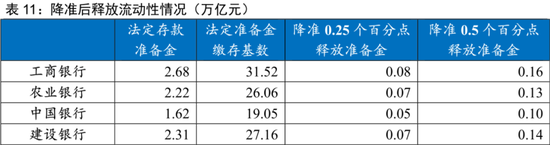 考虑到潘行长在9月24日新闻发布会和10月18日金融街论坛上均提及年内视情况降准0.25-0.5个百分点,此次发行特别国债补充国有大型银行资本,央行可能会顺势下调存款准备金率,在帮助国有大型银行筹措资金的同时释放长期流动性,或用于支持加力化债,或用于置换到期的MLF。按照2024年半年报的法定准备金缴存基数测算,全面降准0.25个百分点,释放六家国有大型银行准备金0.32万亿元,其中农业银行、交通银行和邮储银行共0.13万亿元;全面降准0.5个百分点,释放六家国有大型银行准备金0.63万亿元,其中农业银行、交通银行和邮储银行共0.24万亿元。从降准释放资金和前文测算的补充资本规模匹配度来看,降准0.5个百分点的可能性是更大的。
