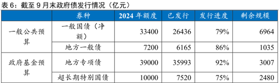 截至9月末,我国国债、地方一般债和地方专项债的发行进度分别为79%、86%和92%,其中专项债通过8-9月提速发行,进度已超过近5年均值。根据财政部新闻发布会提到的专项债券“待发额度加上已发未用的资金,后三个月各地共有2.3万亿元专项债券资金可安排使用”,“中央财政从地方政府债务结存限额中安排了4000亿元,补充地方政府综合财力”,再加上四季度一般国债、地方一般债和特别国债的剩余发行规模,预计四季度计划内可用资金约3.75万亿元。