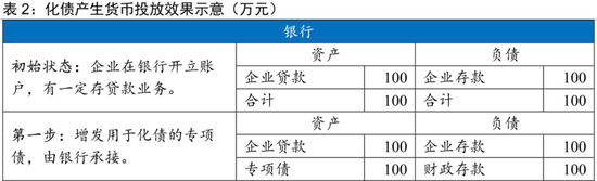 但在利用新增债务化解隐性债务时,需注意可能会产生的货币投放效果和道德风险问题。其一,在地方政府通过新发债务偿还非银行的隐性债务时(如企业欠款),若新发债务由银行承接,则会在银行的资产端增加地方专项债的同时,负债端增加企业存款,扩张了银行的资产负债表,如表2所示。就整个银行体系而言,如果此类存款增长规模较大,将一定程度消耗银行超储,可能会压缩贷款投放等其他资产业务。央行若为保持其他资产业务不变,需为银行增加基础货币投放,在此过程中应避免投放过度。
