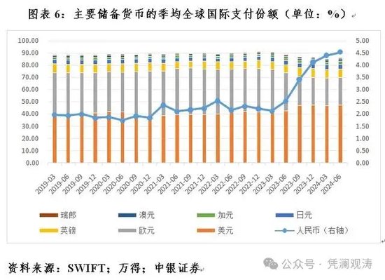 评价货币国际化进展有多个维度。从国际支付的角度看,人民币国际化失之东隅收之桑榆。根据SWIFT数据,自2023年11月起,人民币在全球国际支付的份额超过日元,跃居第四位。到2024年二季度,人民币国际支付季均份额为4.53%,较2021年四季度上升了2.30个百分点。同期,美元、英镑、日元、加拿大元、澳大利亚元、瑞士法郎的国际支付份额分别上升了7.82、0.58、1.09、0.86、0.32、0.32个百分点,欧元下降了14.75个百分点(见图表6)。可见,从国际支付角度看,也是欧元而非美元,成为地缘政治冲突最大的牺牲品,人民币国际化在这个维度上则是受益方。